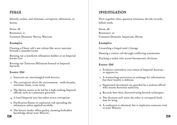 - A BUNCH of tables for quickly randomizing any given Mission, as well as ways to complicate it, introduce plot twists, establish characters in conflict with each other and describe the warp seeping through reality.