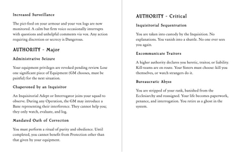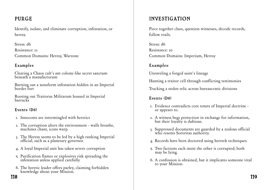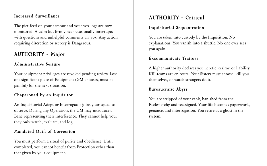 The game is built on the Resistance system (in the lineage of Spire and Heart), focusing on stress, fallout, and consequences rather than hit points and turn order. Your characters are competent and deadly, but every success risks damage to their bodies, their faith, their standing with the Ecclesiarchy, or their souls. Character advancement and growth happens in Beats, specific actions and situations the players are encouraged to seek out and which illustrate the tripartite pull of dogmatic purity, compassionate humanity and brushes with heresy and corruption.