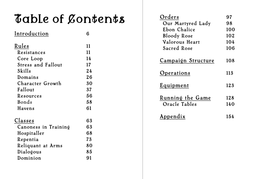 - Six complete classes: the groomed-for-leadership Canoness In Training, the fervently violent Sister Repentia, the unsettlingly cold torturer-healer Hospitaller, the elite Dominion fighter, the Sister Dialogous shaping material reality with words alone and the Reliquant at Arms anchoring her sisters through the power of holy relics